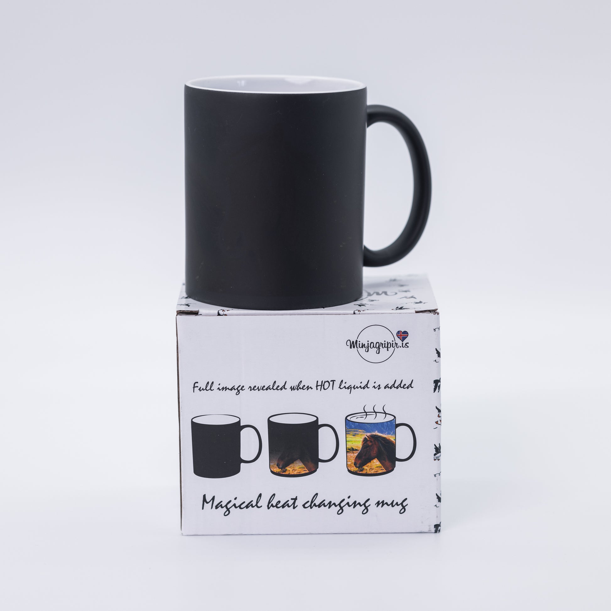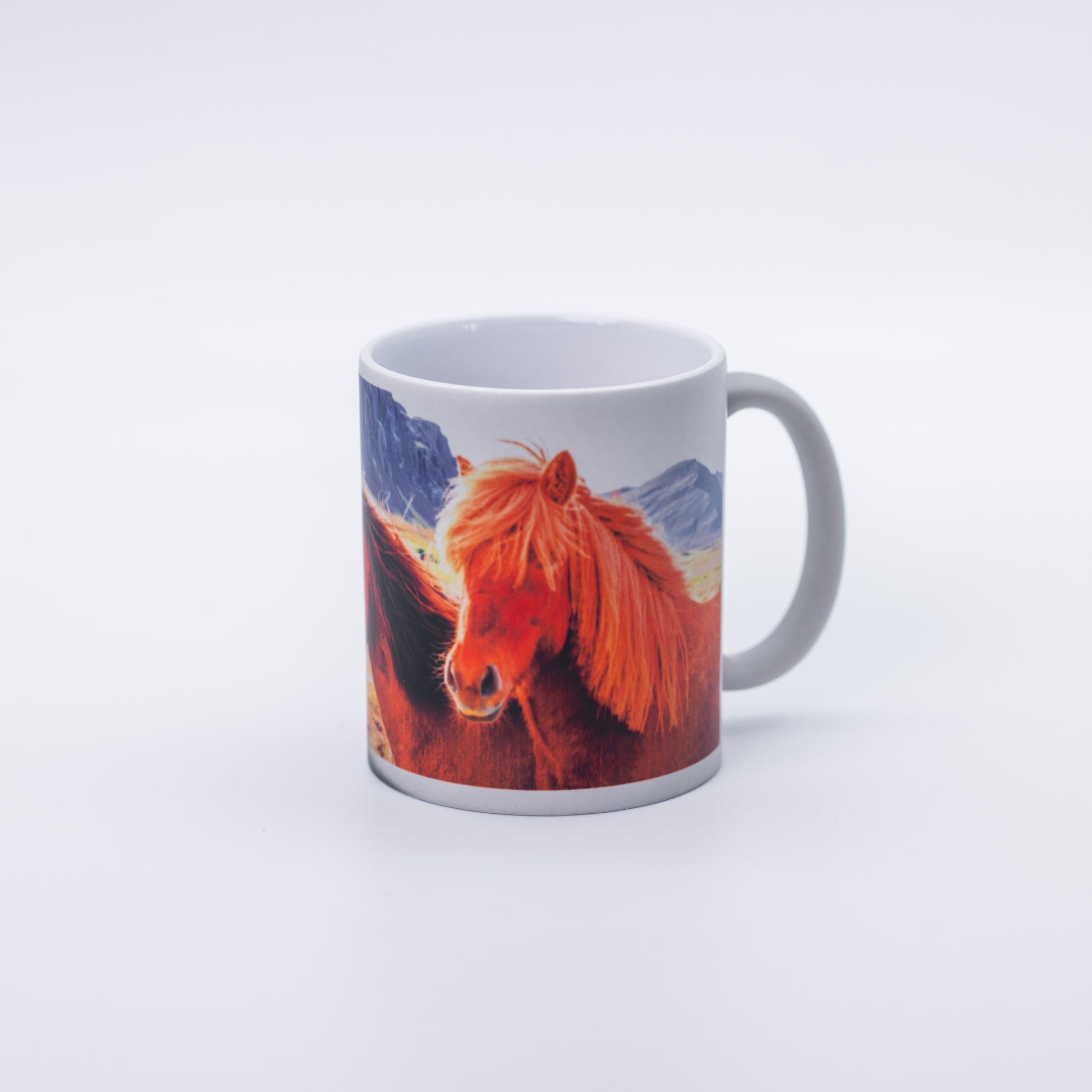 Heat-sensitive mug featuring majestic horses, revealing vivid scenes when exposed to heat.