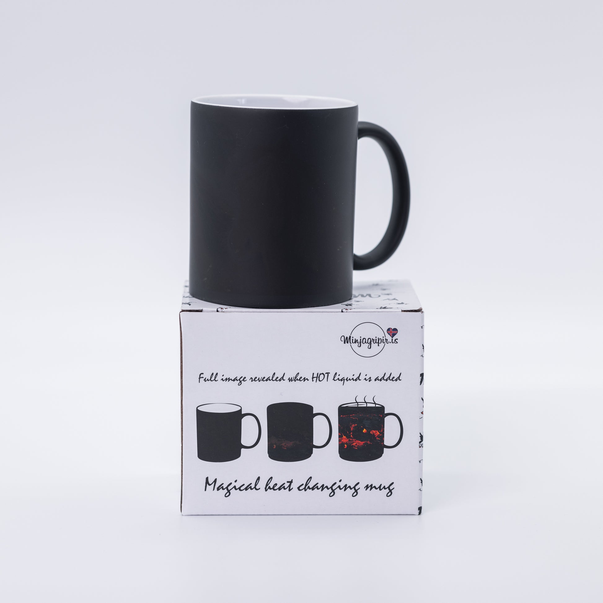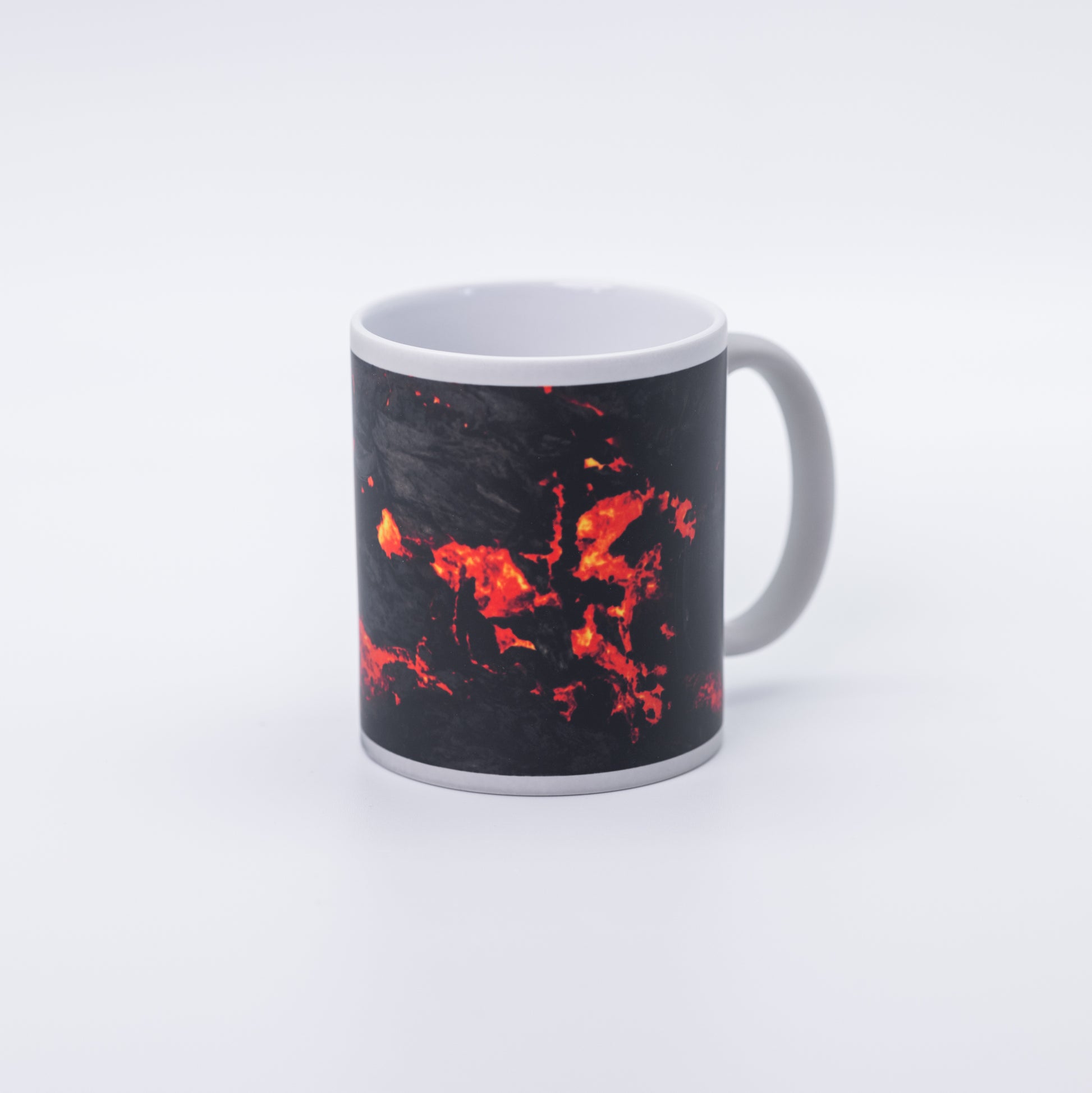 Heat-sensitive mug featuring volcanic lava fields, revealing detailed patterns when filled with a hot beverage.