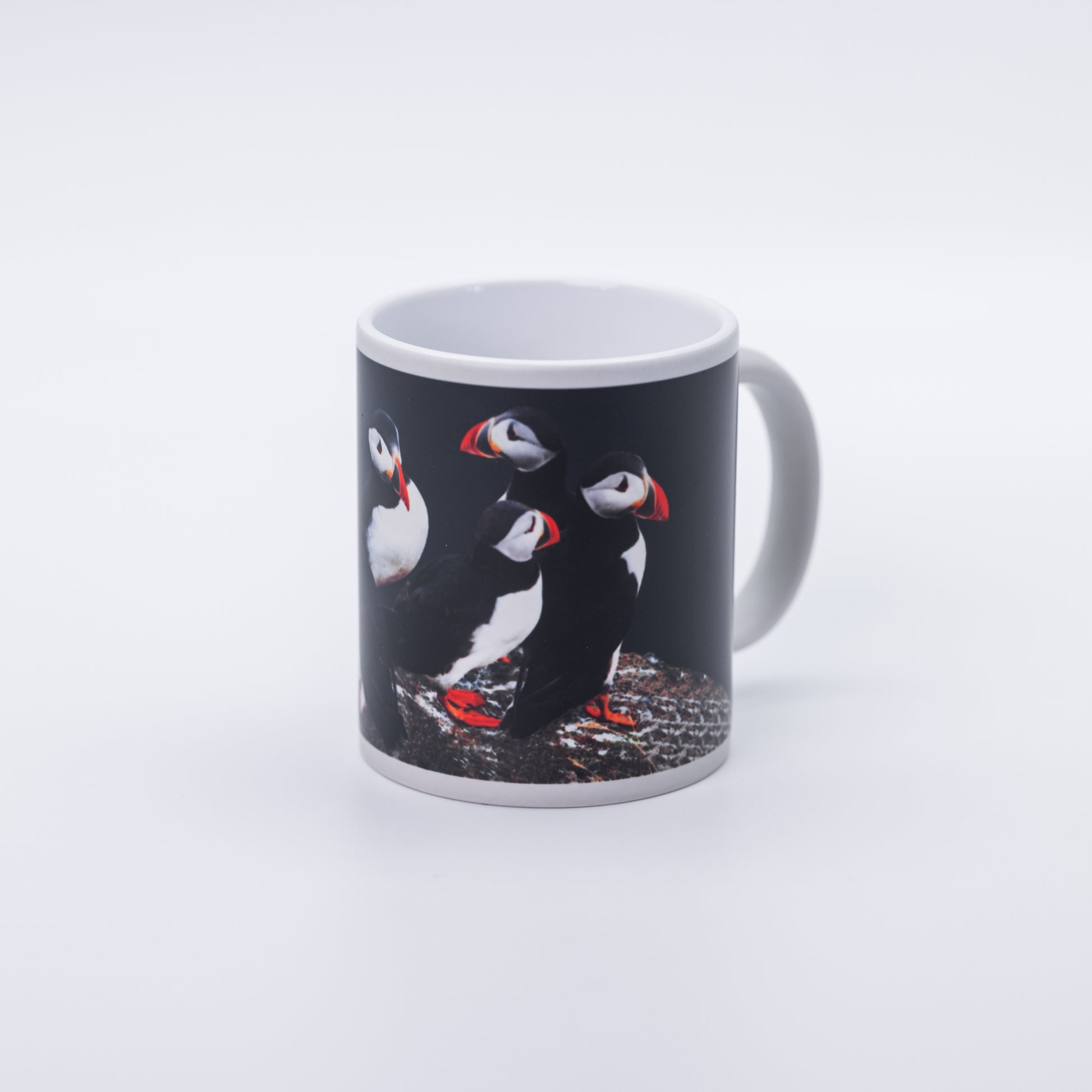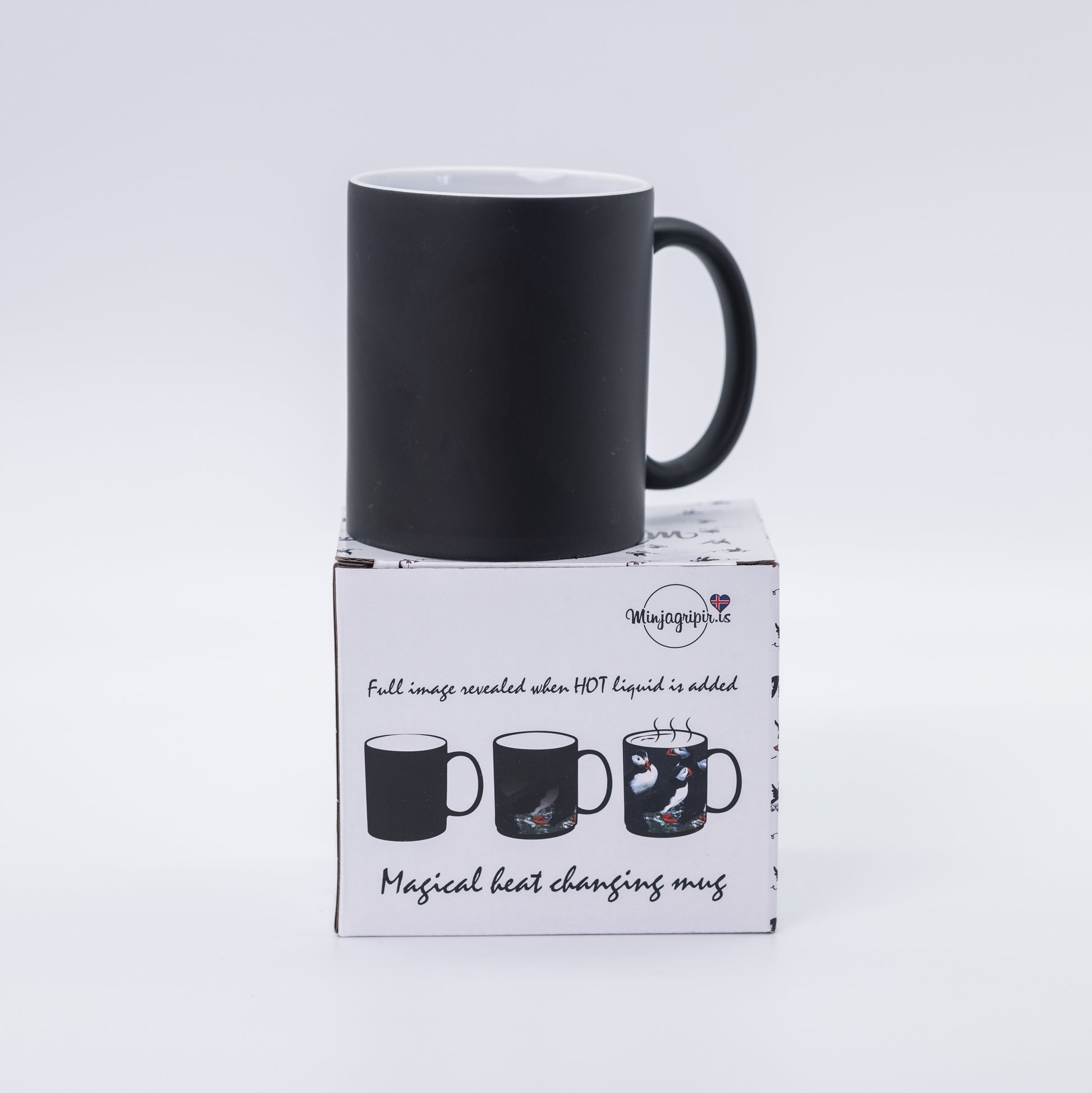 Heat-sensitive mug featuring adorable puffins that reveal their vivid colors when warmed by your favorite hot drink.