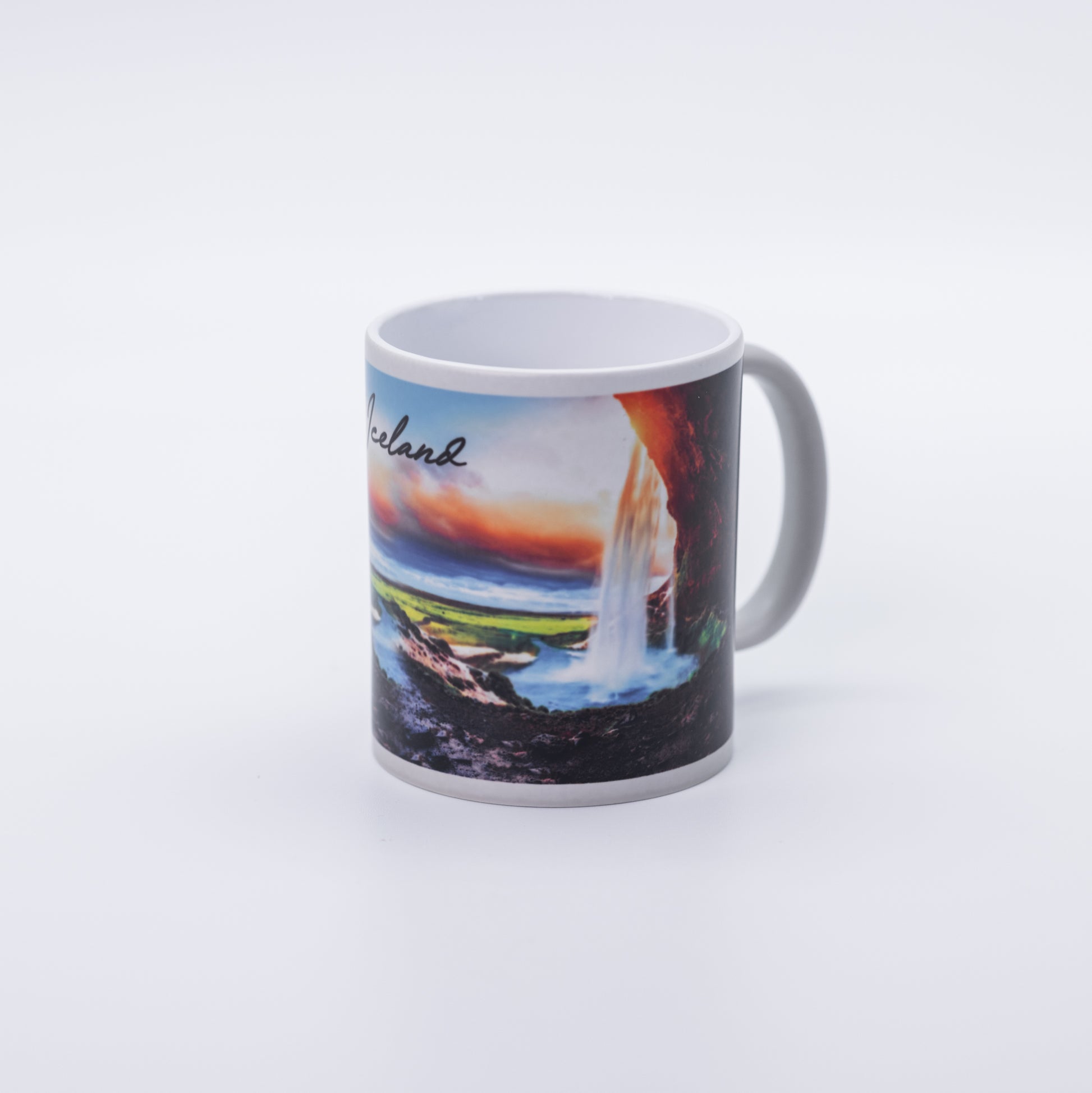 Heat-sensitive mug featuring the Seljalandsfoss waterfall, revealing hidden details when you pour in a hot drink.