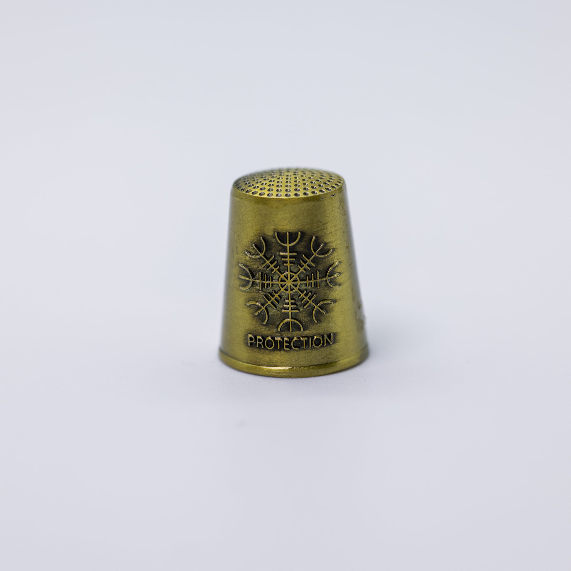Thimble with Aegishjalmur symbol and a Viking ship, combining Icelandic runic magic and maritime history.
