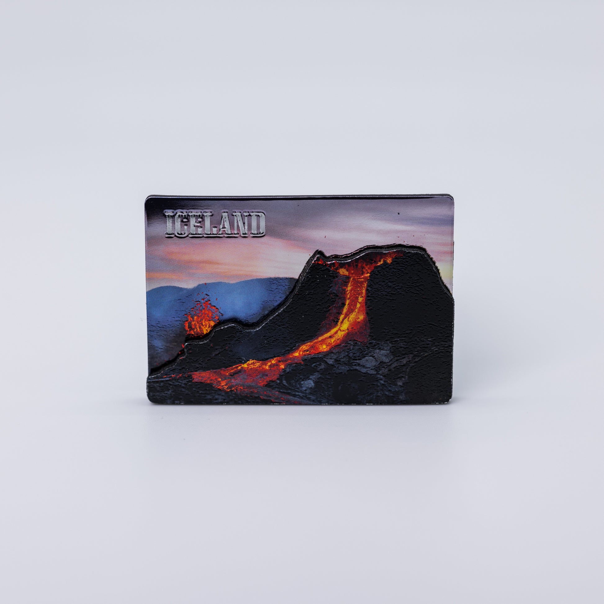 Glossy refrigerator magnet depicting a volcanic eruption, showcasing Iceland's fiery landscapes.