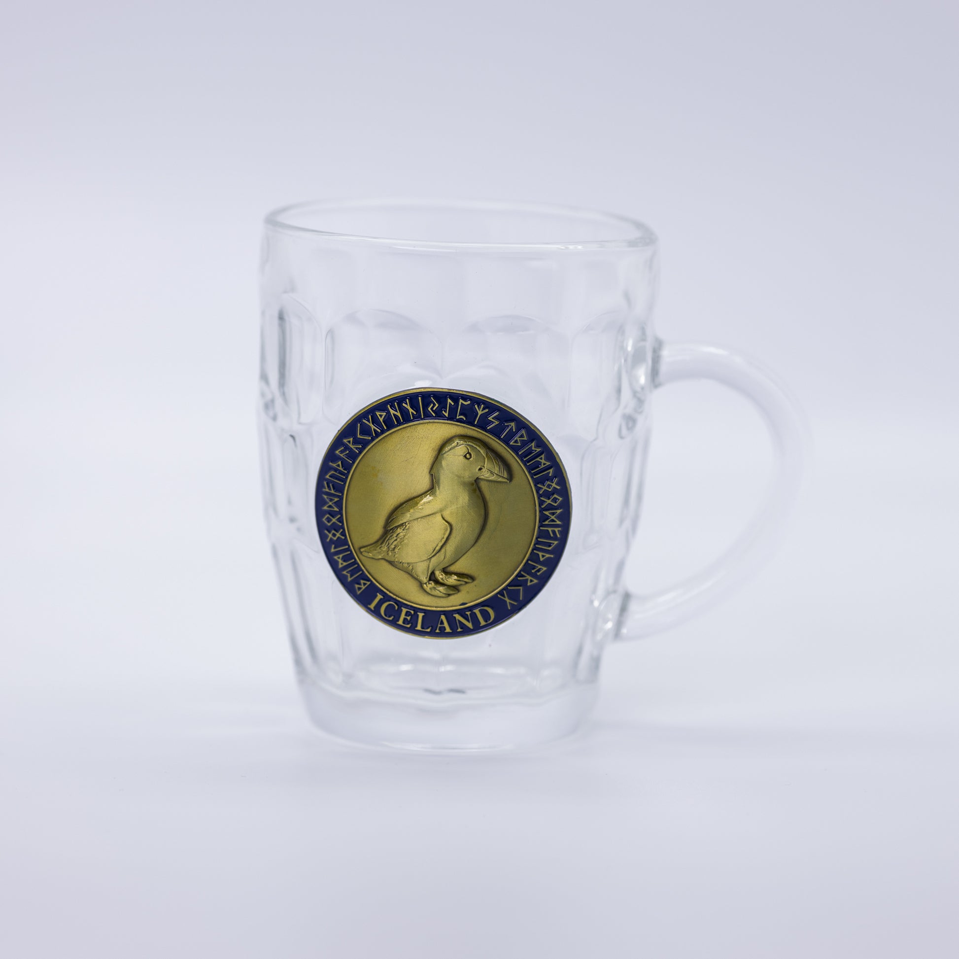 Golden beer glass featuring a puffin design, adding Icelandic charm to your beverage.