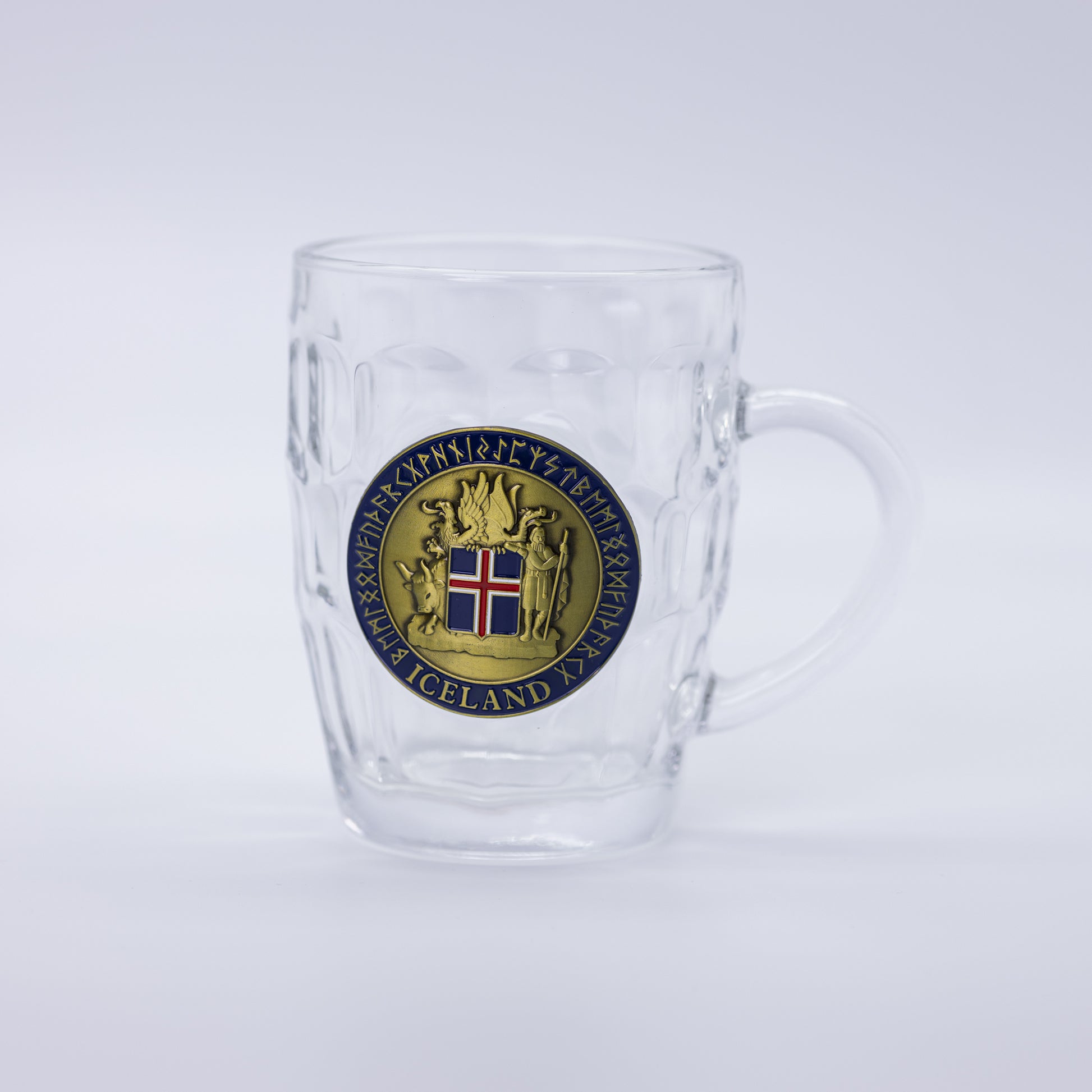Golden beer glass with Icelandic coat of arms, perfect for raising a toast to Iceland.