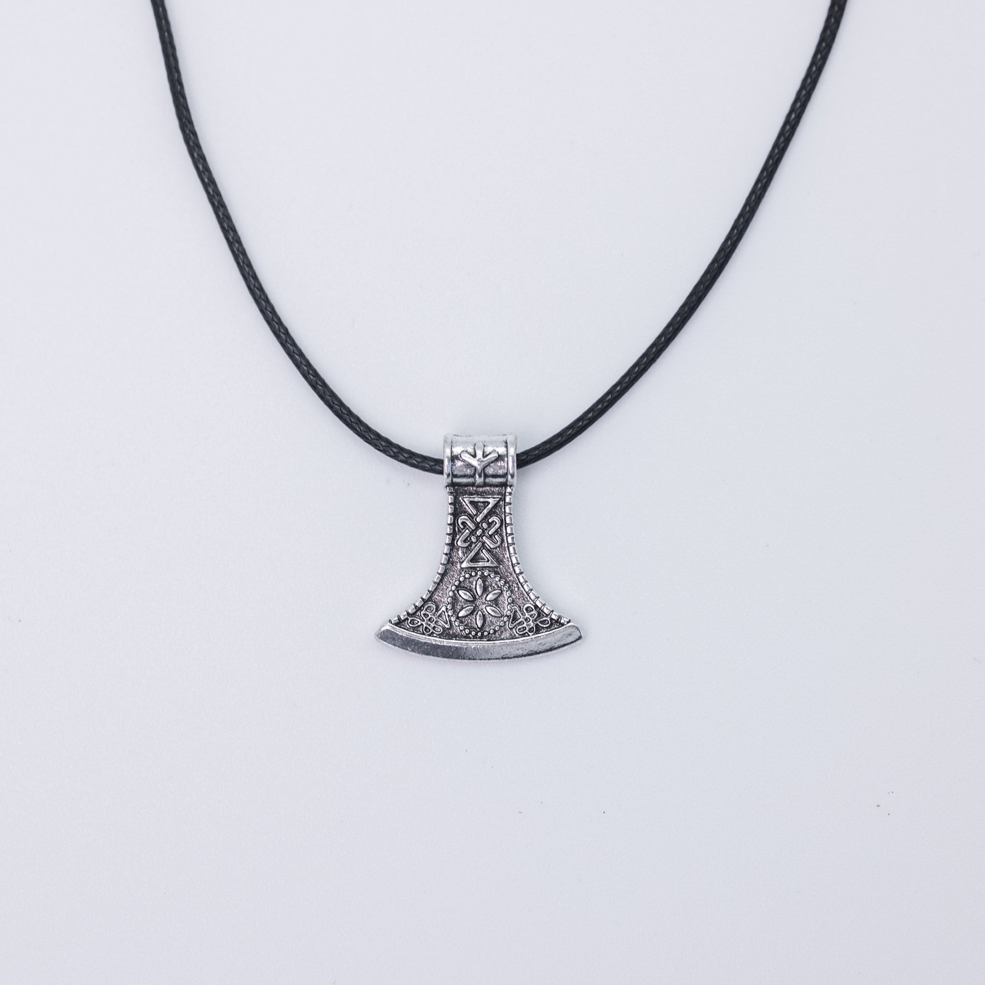 Pendant necklace featuring an axe design on a leather cord, inspired by Viking heritage.