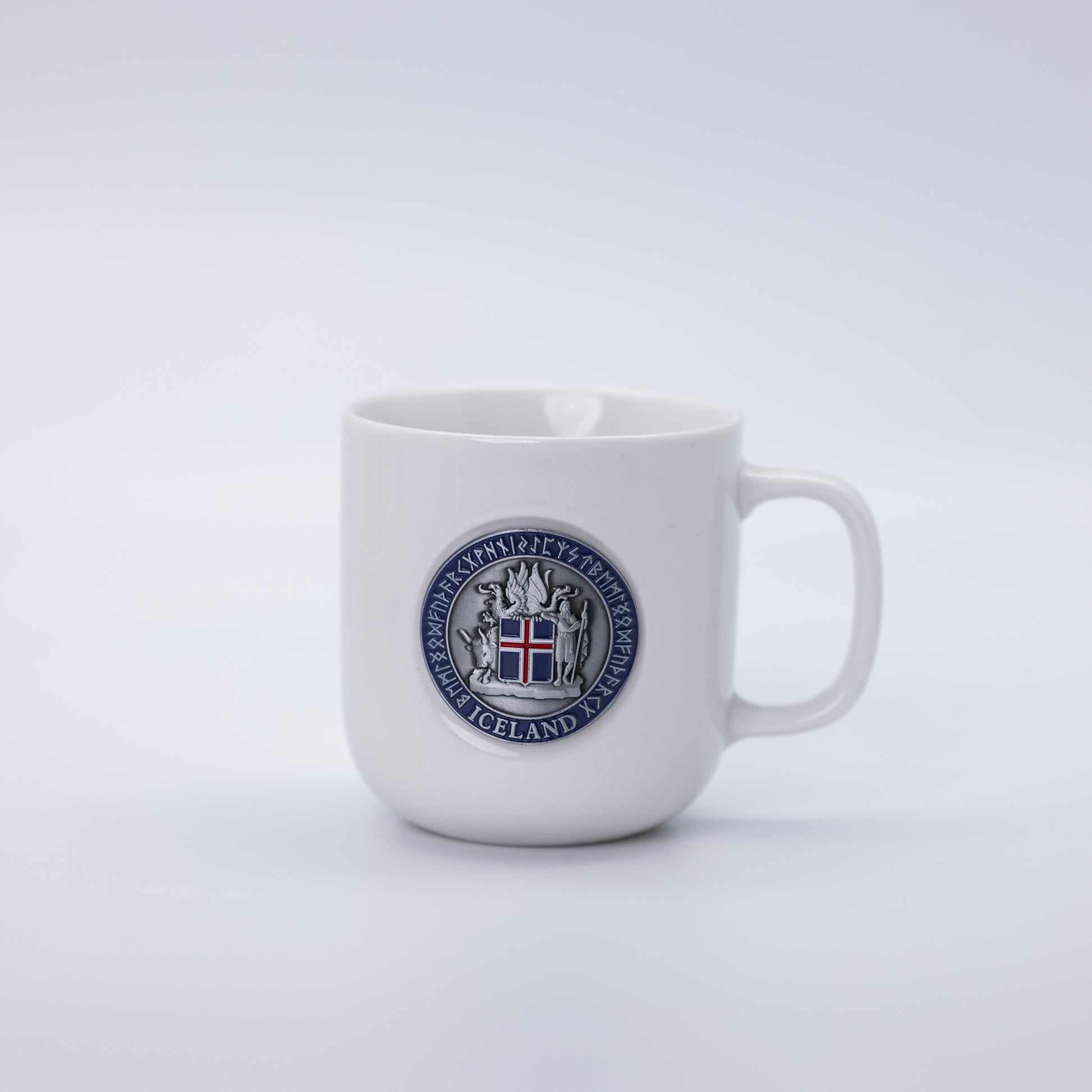 White porcelain mug with silver rim featuring Iceland's coat of arms, providing an elegant and patriotic vessel for your drink.