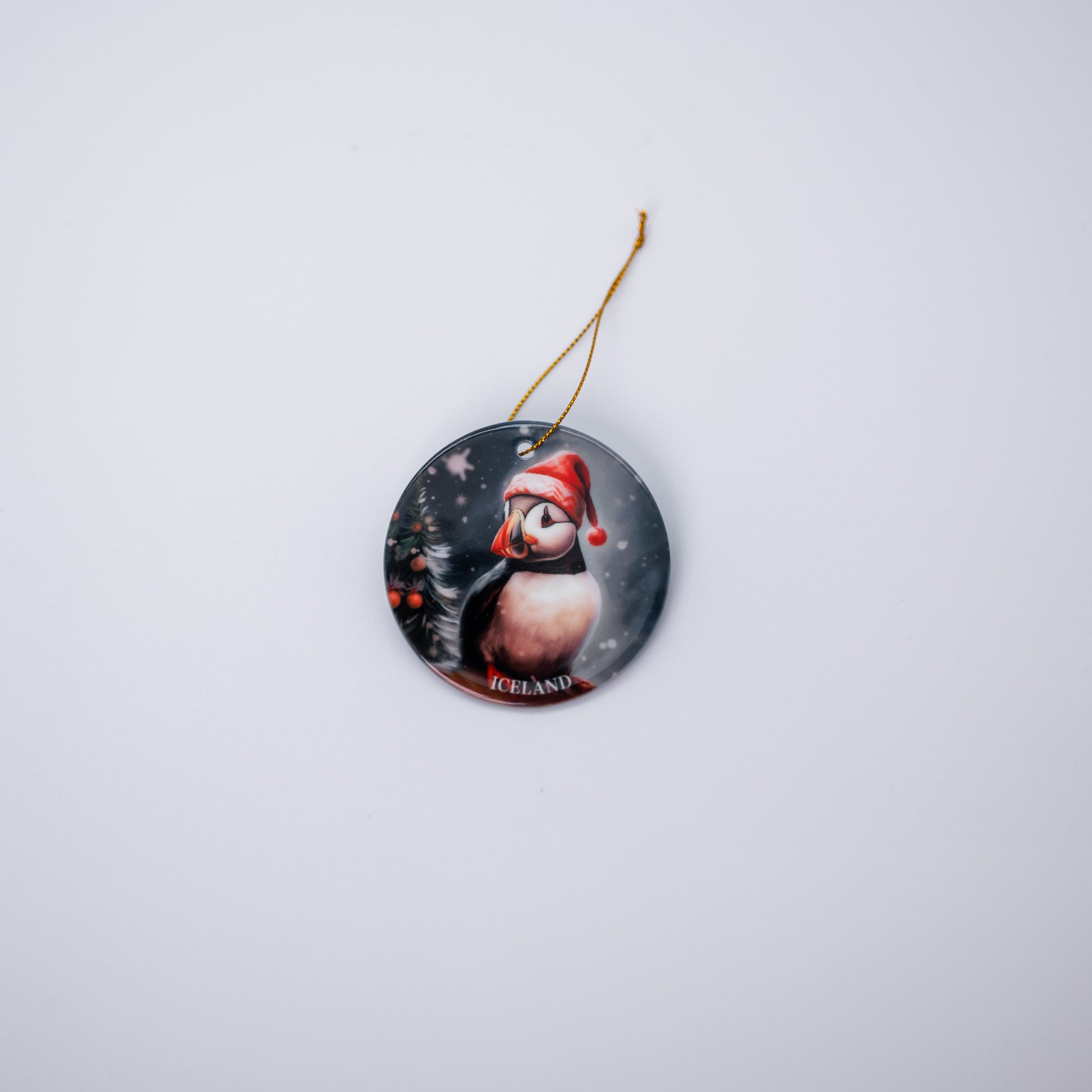 Porcelain Christmas ornament featuring a puffin wearing a festive hat, bringing Icelandic whimsy and holiday joy