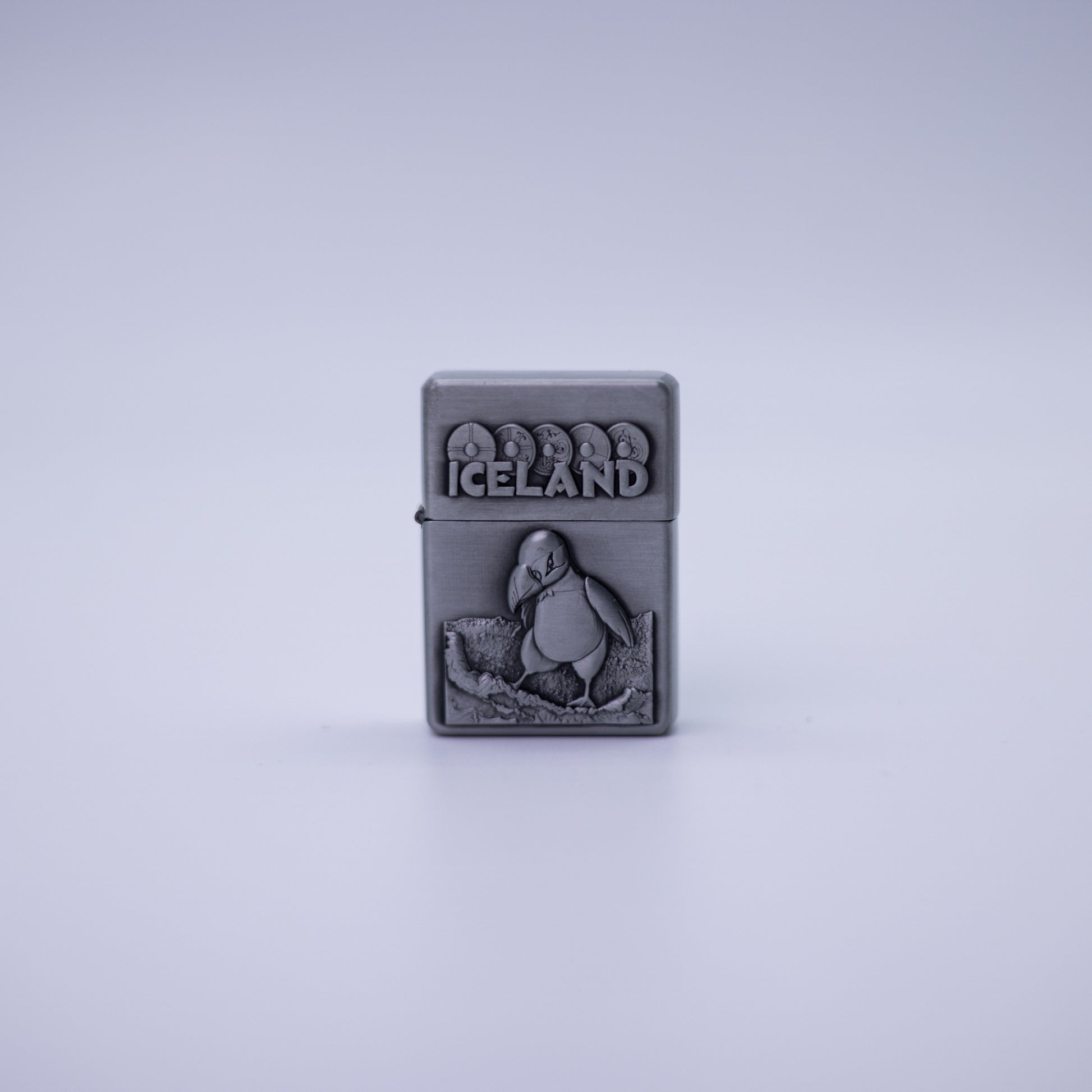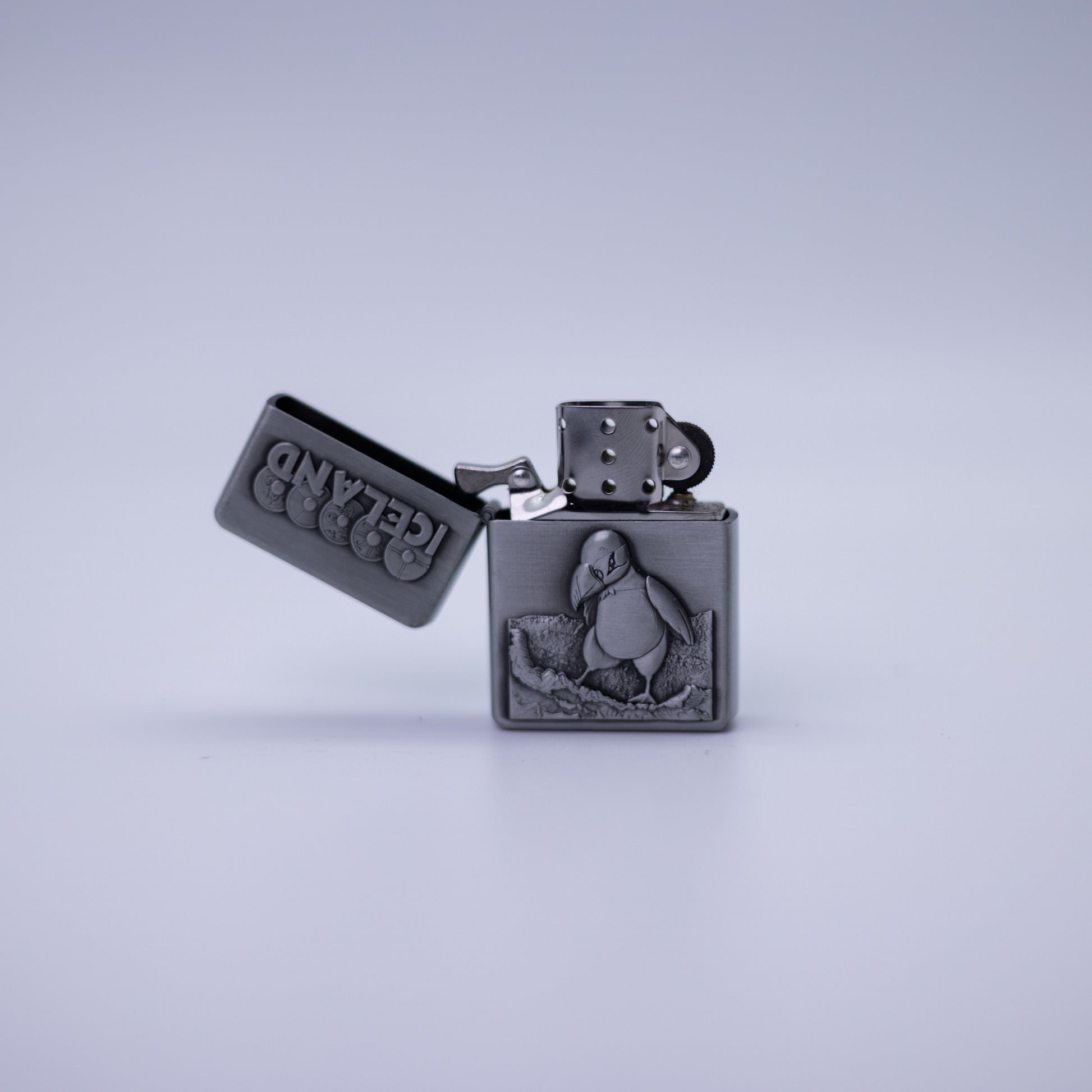 Metal lighter in silver color featuring a puffin design, combining practical use with Icelandic wildlife charm.