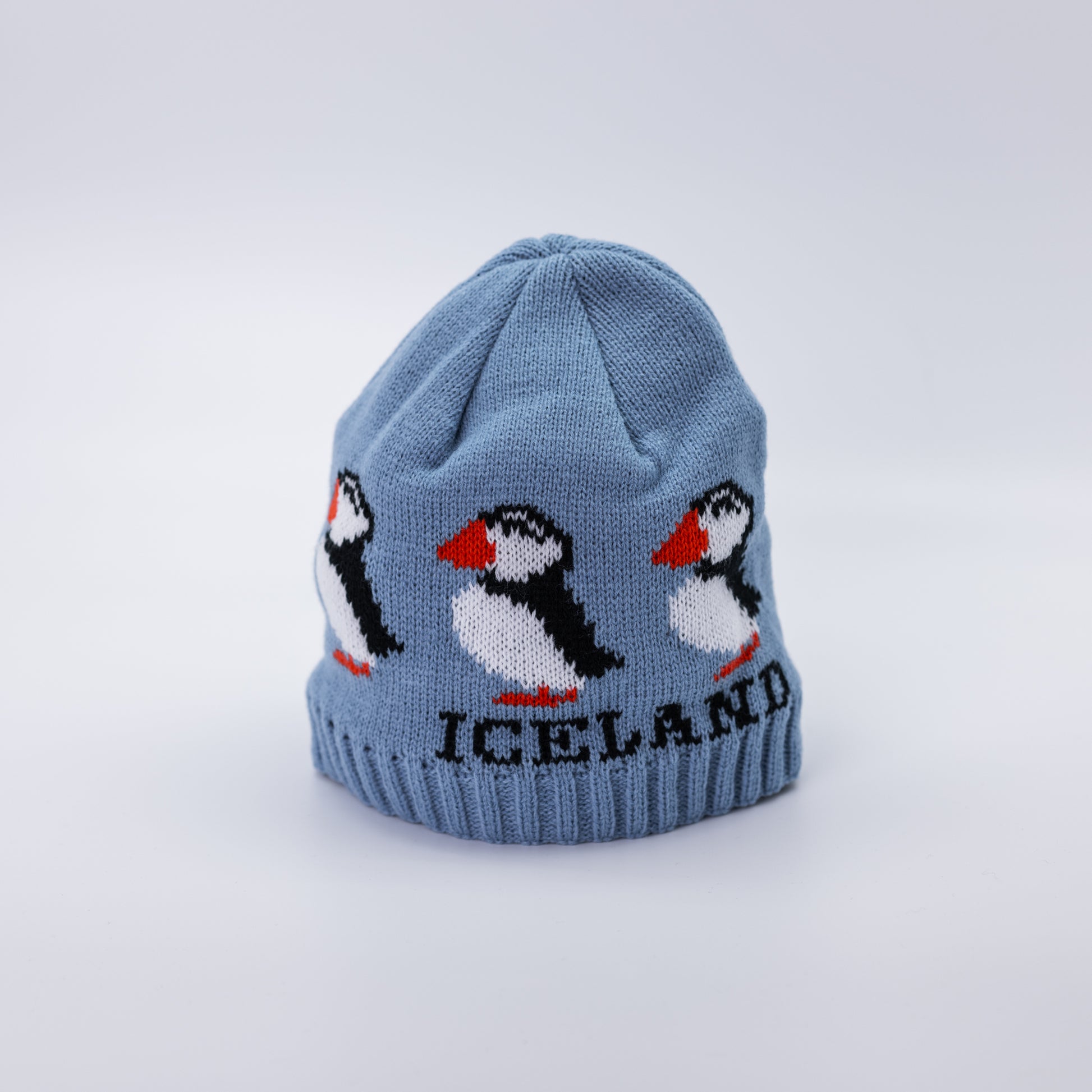 Beanie featuring a puffin design in blue, offering warmth and cute Icelandic style
