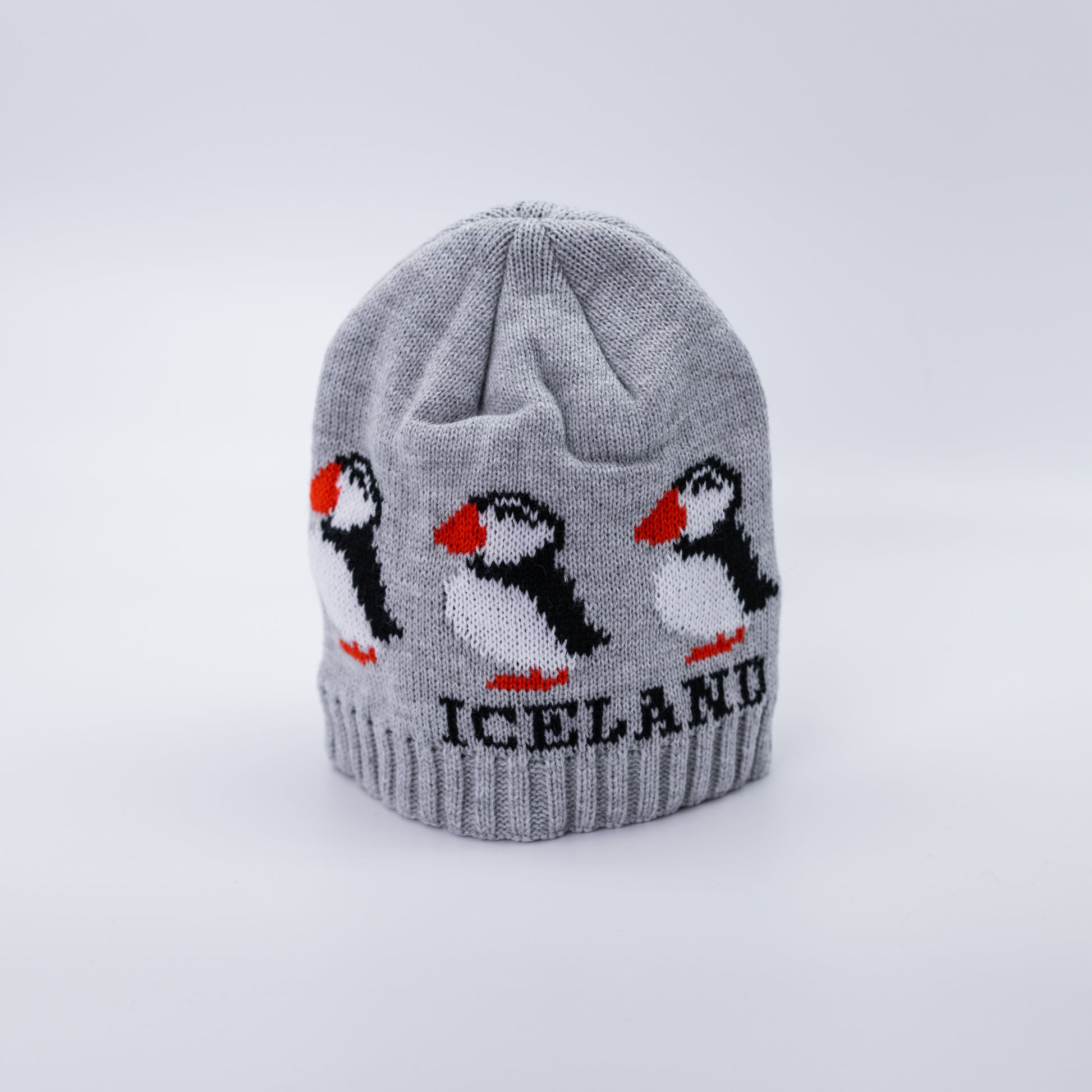 Beanie featuring a puffin design in gray, offering warmth and cute Icelandic style