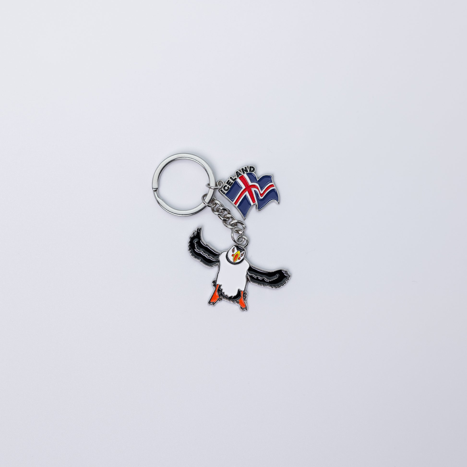 Keychain featuring a flying puffin and an Icelandic flag, adding playful national charm to your keys
