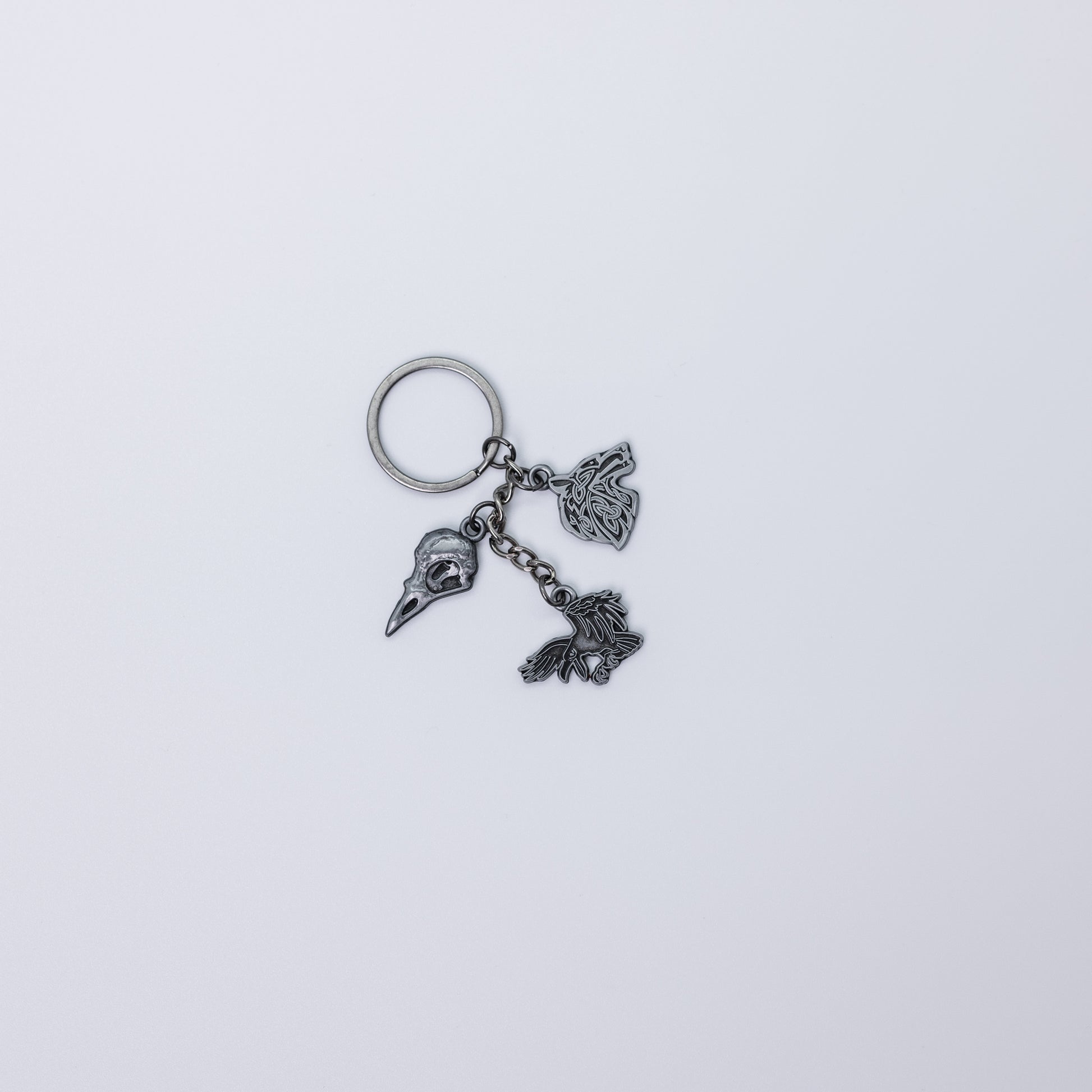 Keychain featuring a raven, Fenrir, and skull design, blending mythical and gothic motifs with Icelandic flair.