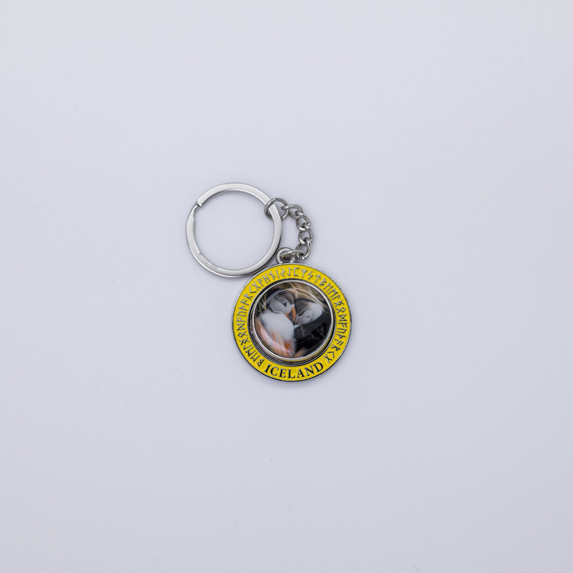 Keychain featuring an image of a puffin on a yellow background, adding colorful Icelandic charm to your keys