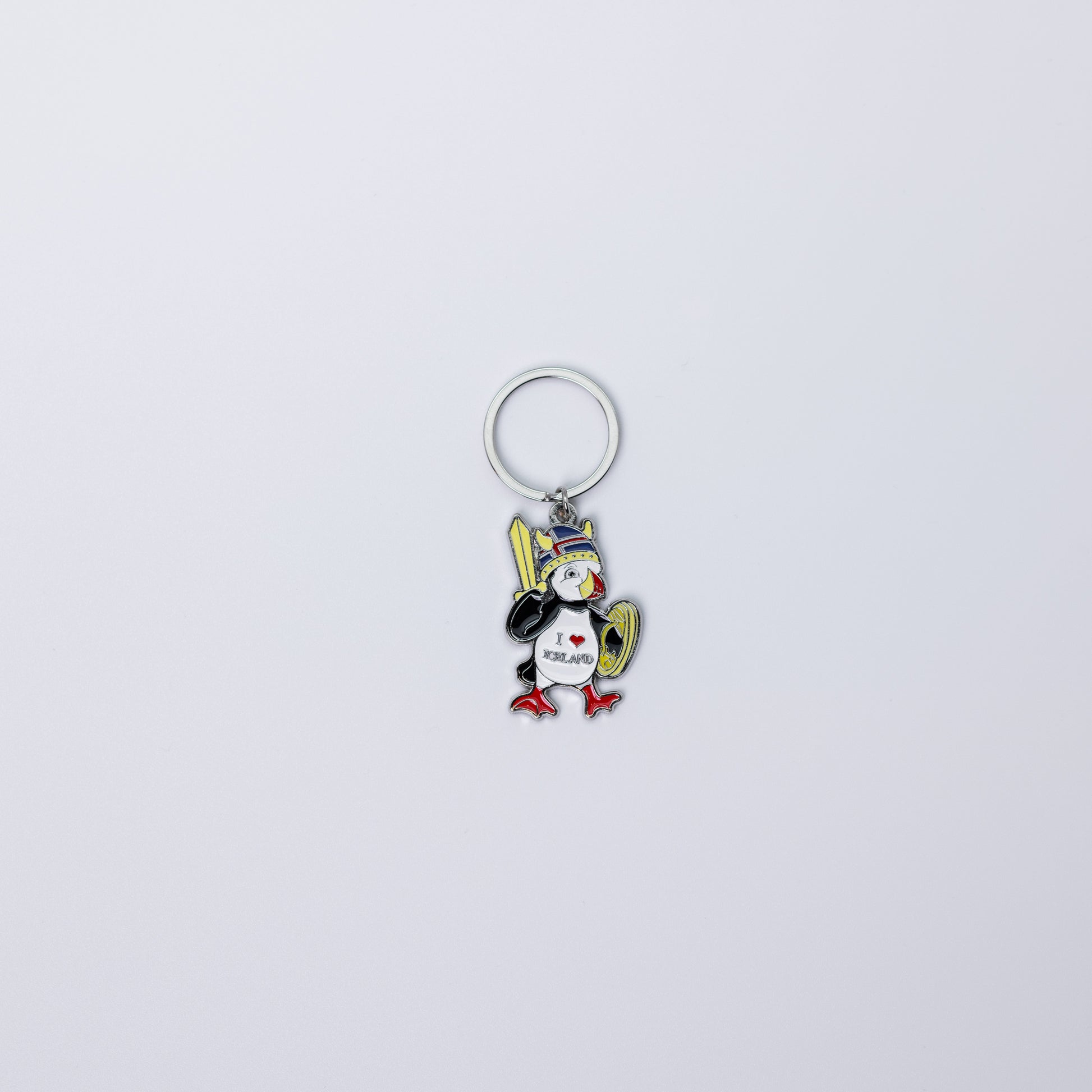 Keychain featuring a puffin dressed as a Viking in yellow, bringing playful Nordic warrior charm to your keys.