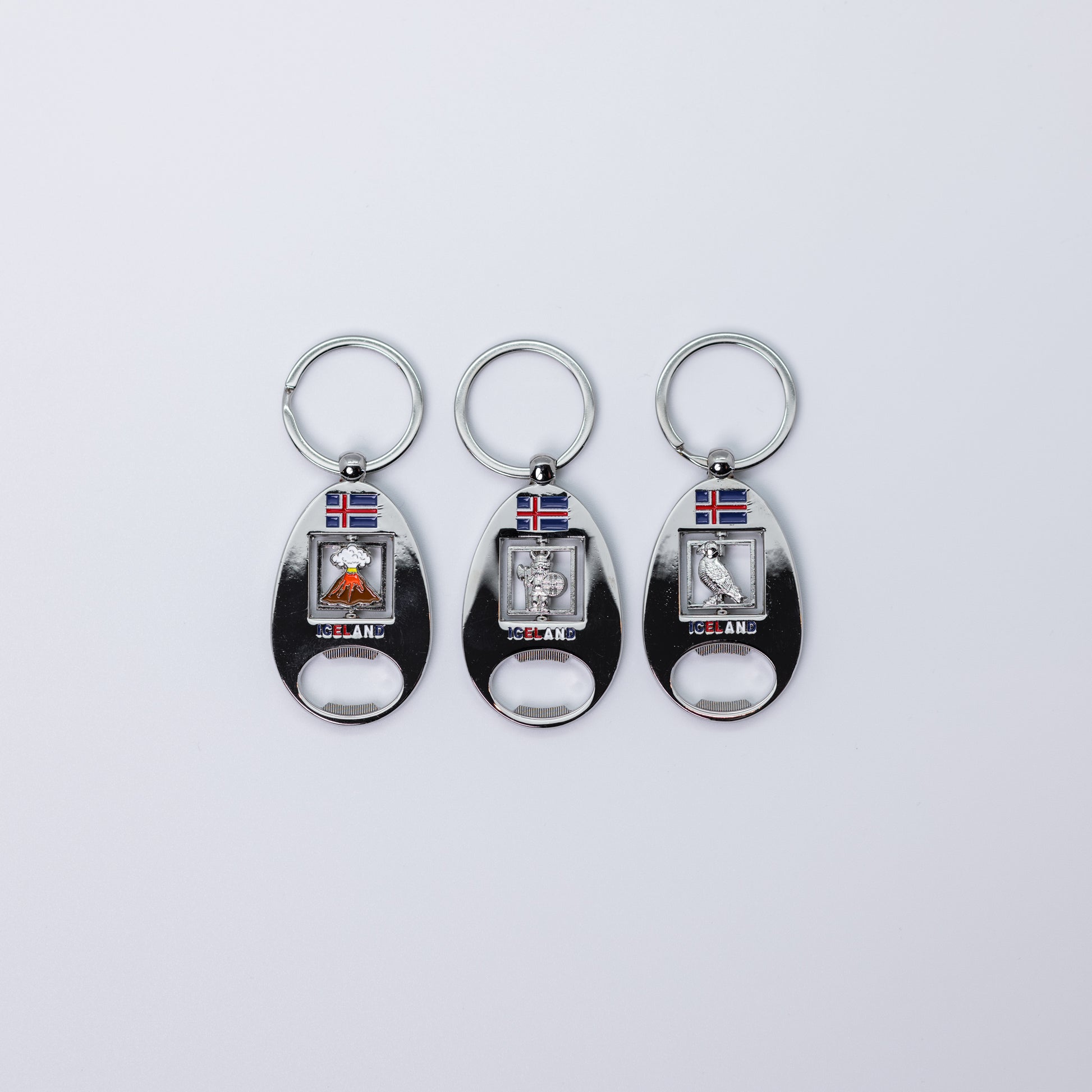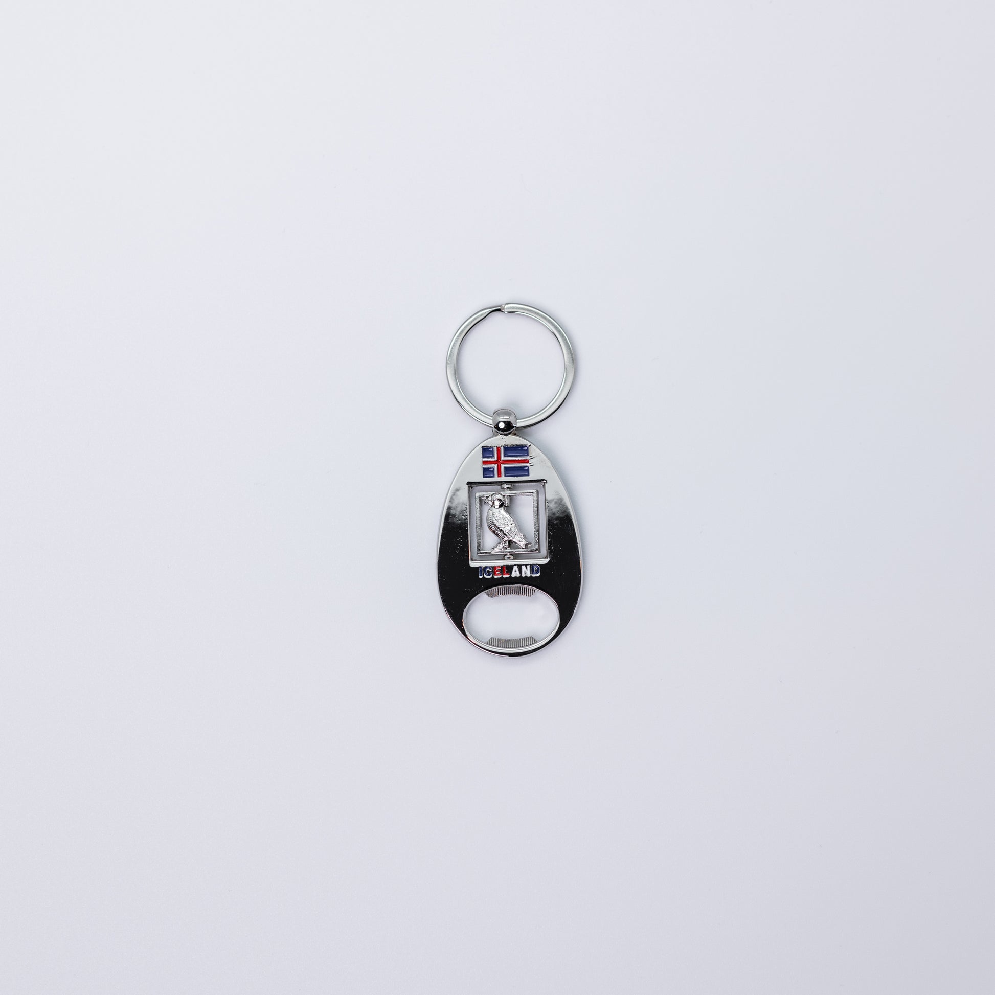Spinner bottle opener keychain featuring a puffin design, combining functionality with Icelandic wildlife charm.
