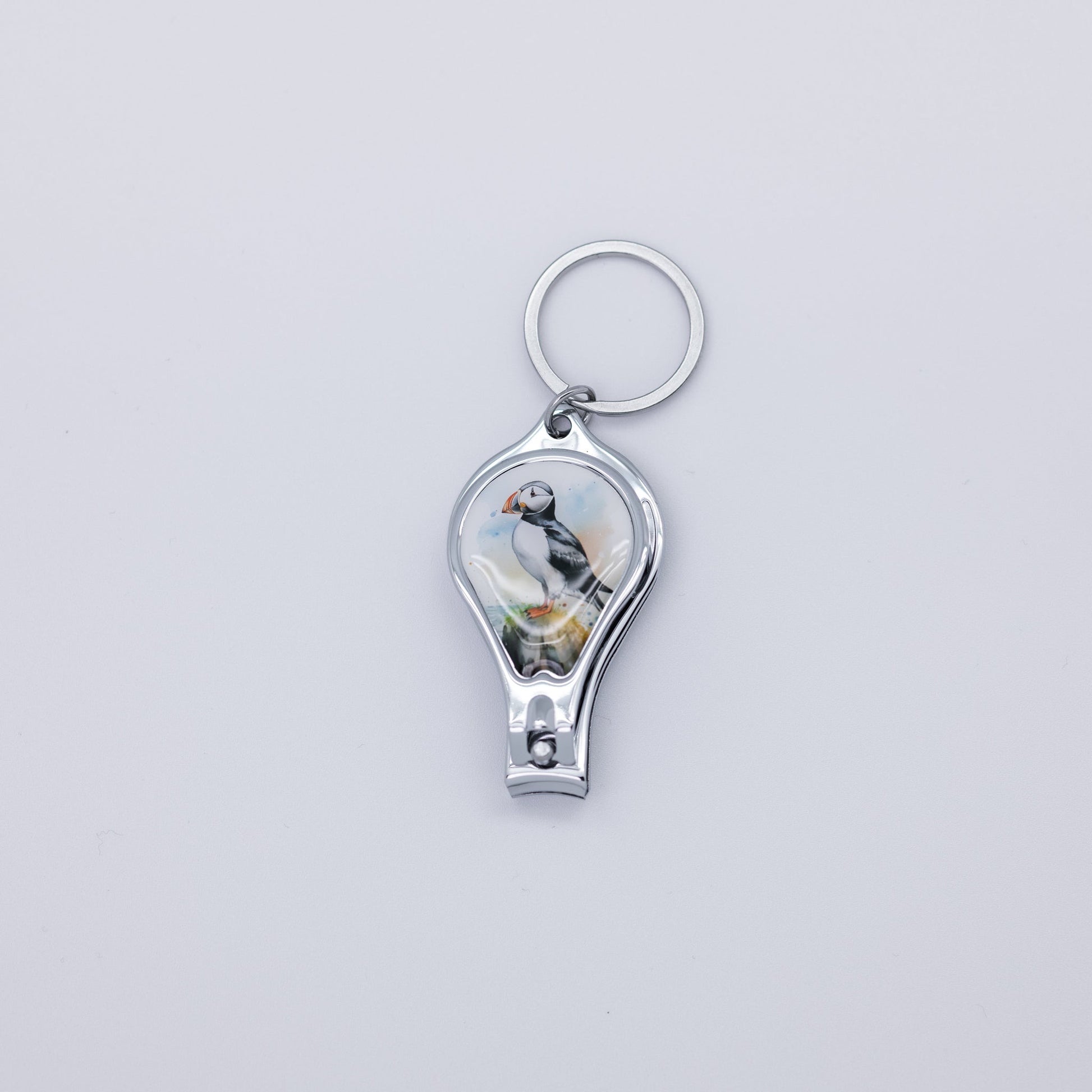 Nail clippers featuring a puffin design with an integrated bottle opener on the back, combining practicality with Icelandic wildlife charm