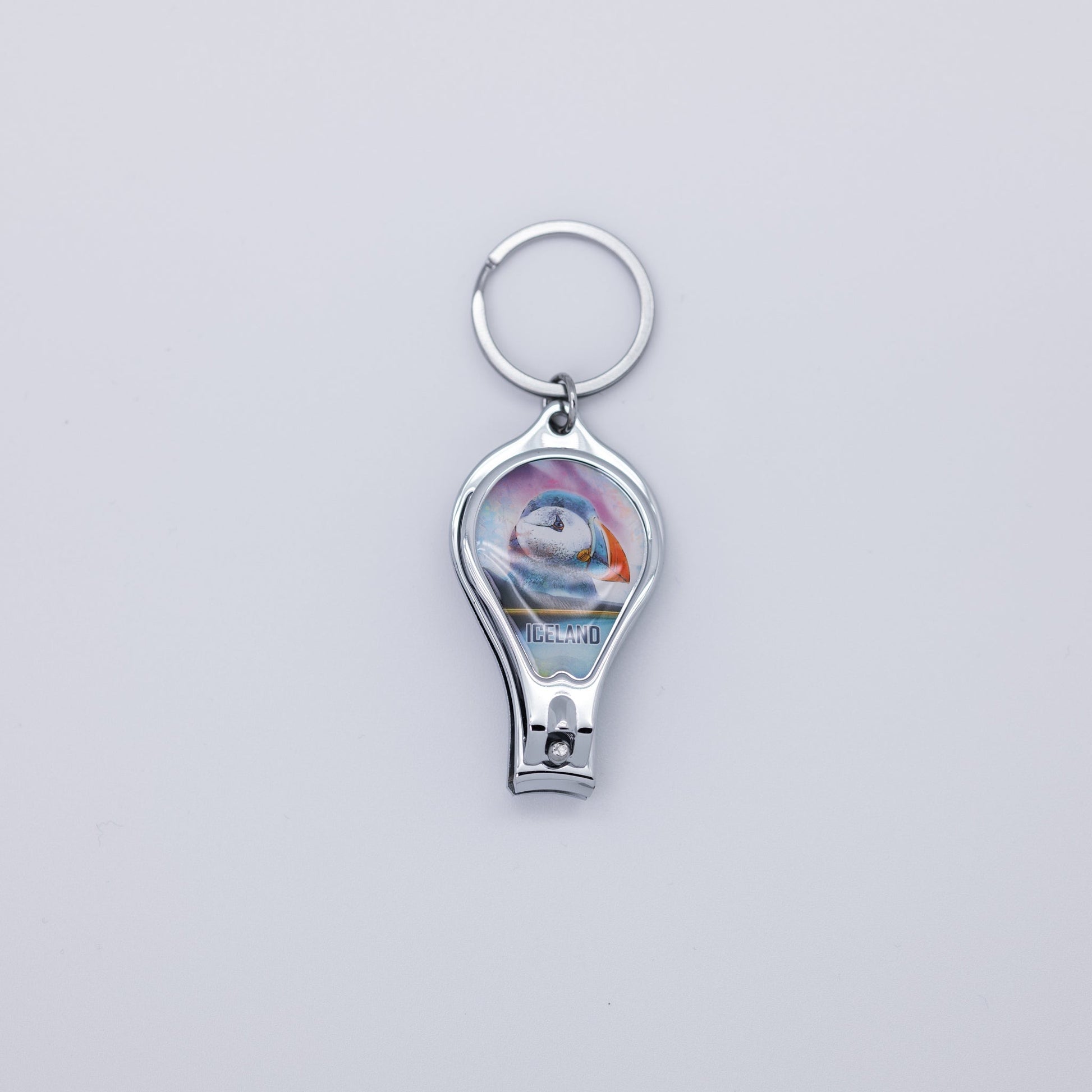Nail clippers featuring a puffin watercolor design with an integrated bottle opener on the back, combining practicality with artistic charm