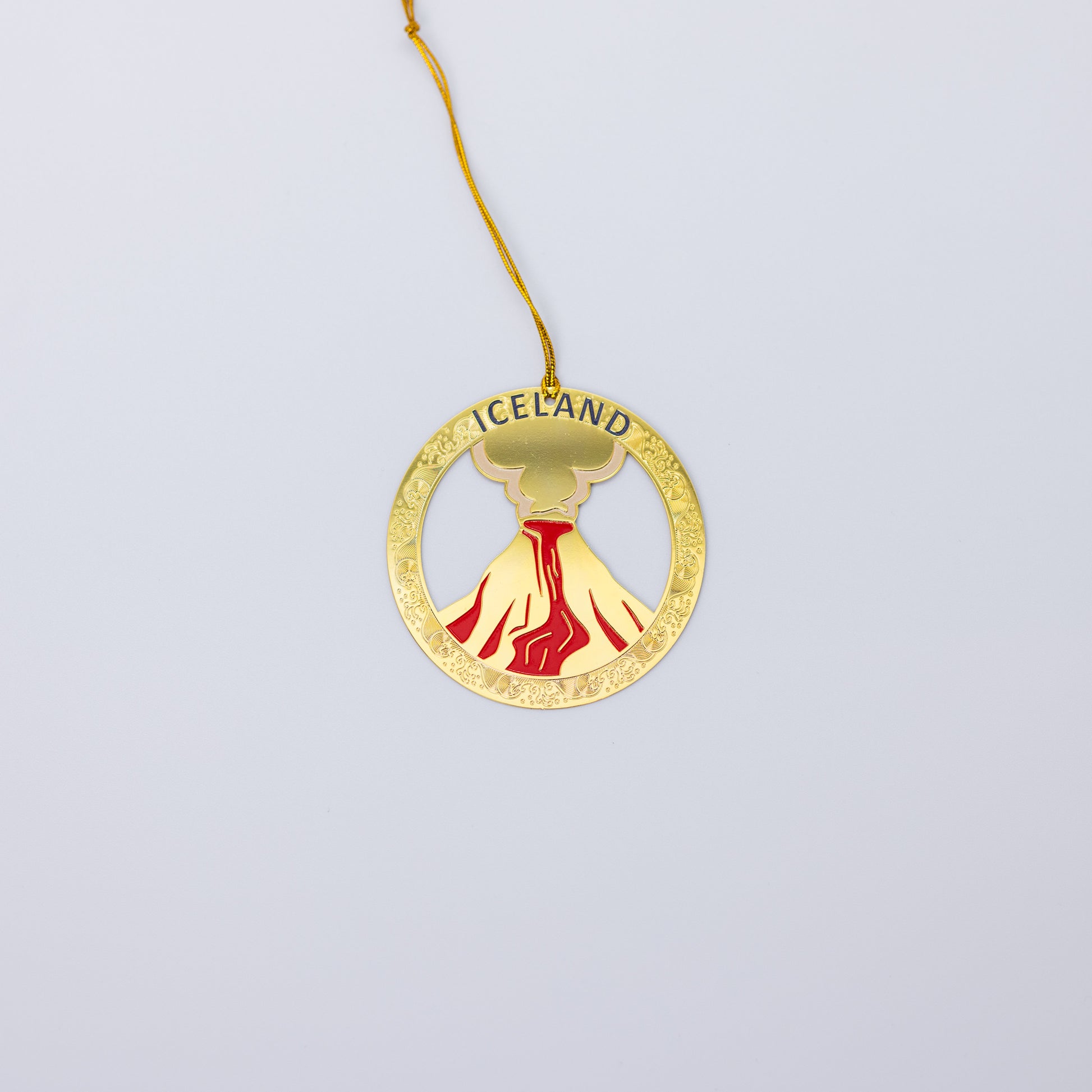 Hanging ornament in gold featuring a volcano motif, perfect for adding Icelandic eruption charm to your holiday decor