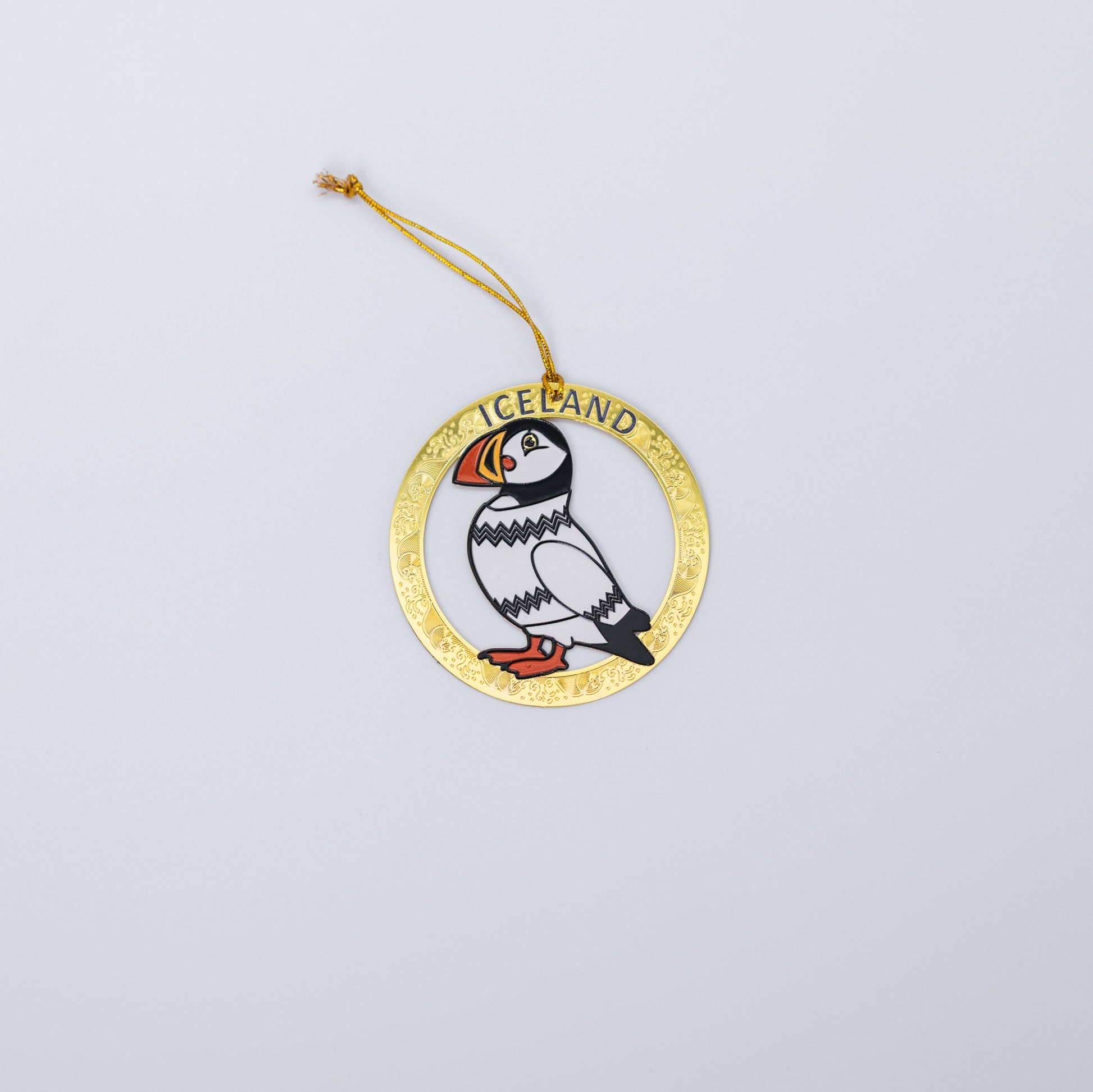 Hanging ornament in gold featuring a puffin wearing a traditional lopapeysa sweater, blending Icelandic wildlife and knitwear charm into your holiday decor
