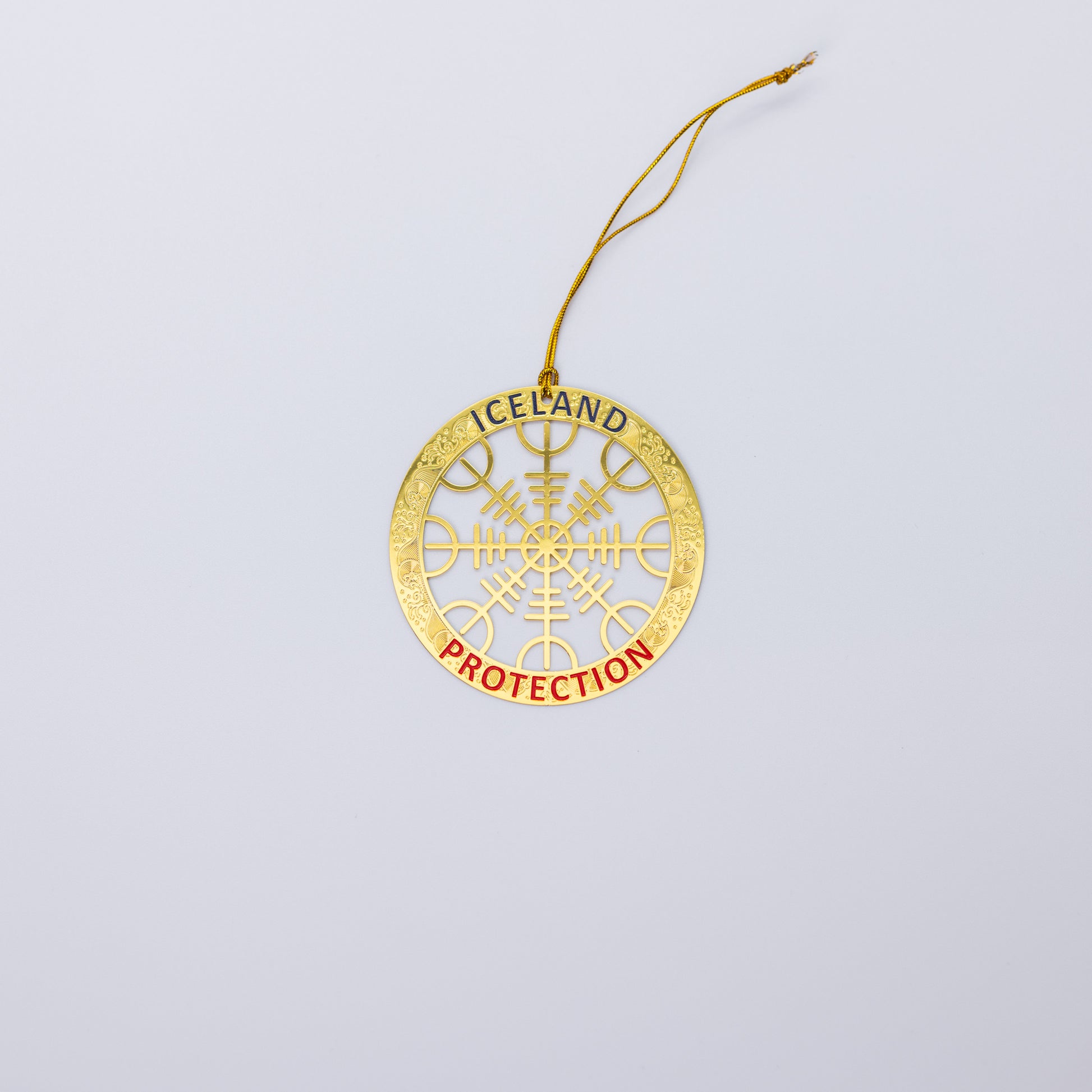 Hanging ornament in gold featuring the word 'Protection', bringing a protective message and Icelandic inspiration to your holiday decor