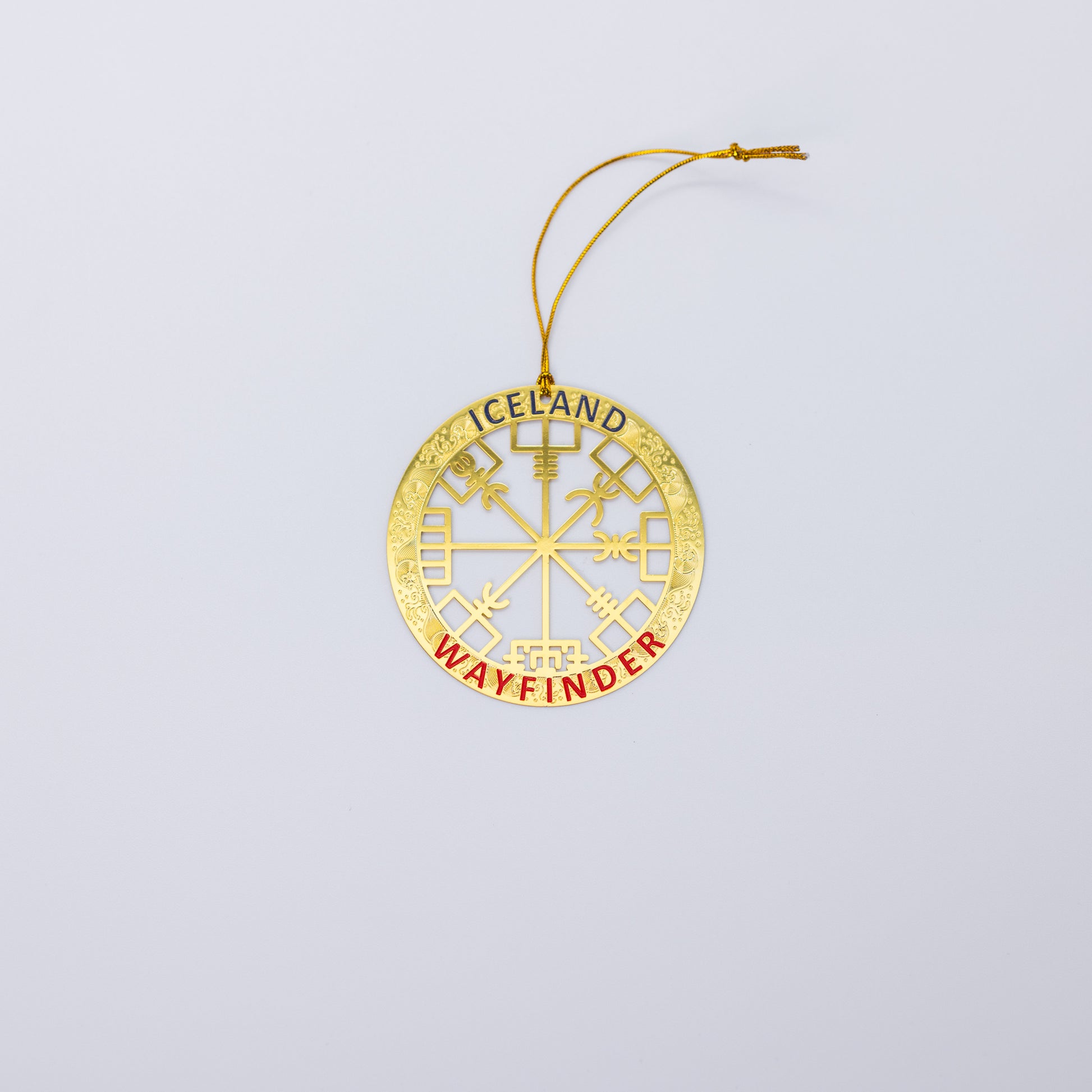 Hanging ornament in gold featuring the Wayfinder (Vegvísir) symbol, guiding your holiday decor with Icelandic tradition