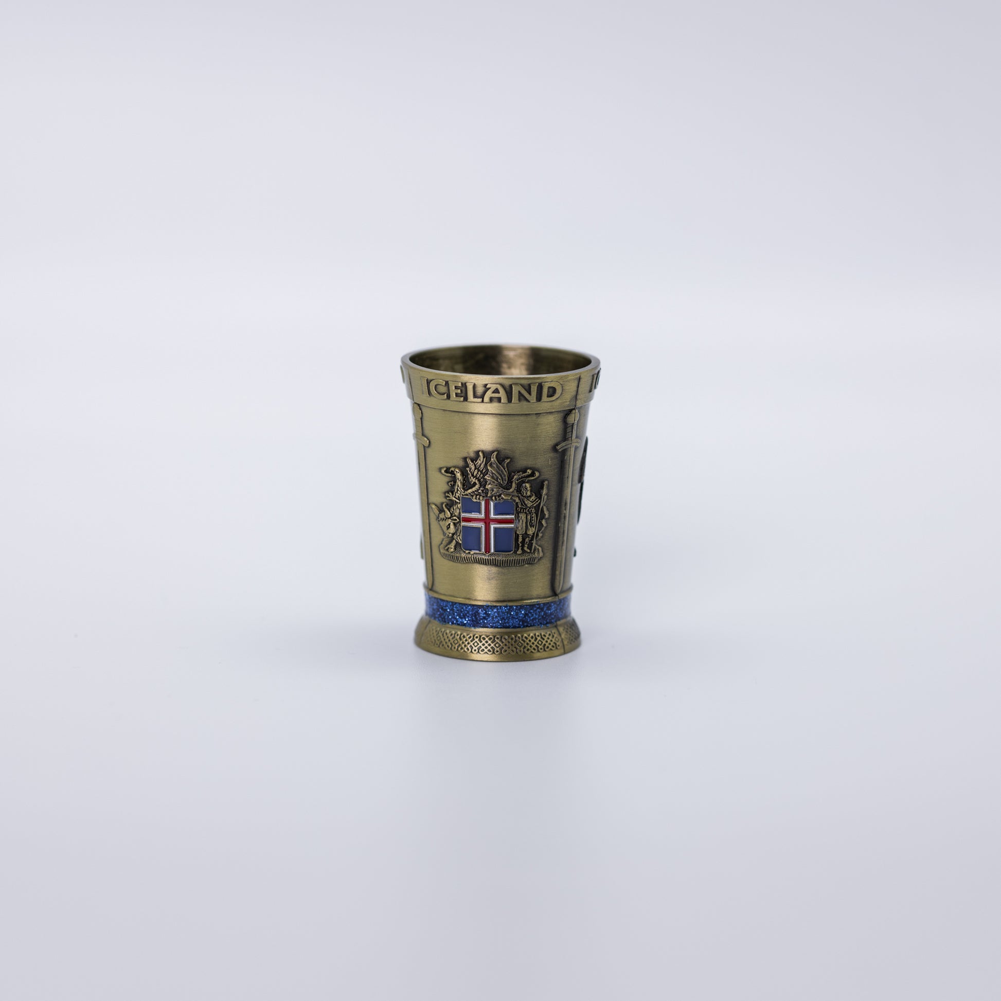 Steel shot glass with a gold finish featuring the Icelandic coat of arms, puffin, and Hallgrímskirkja church, blending durability with iconic symbols.