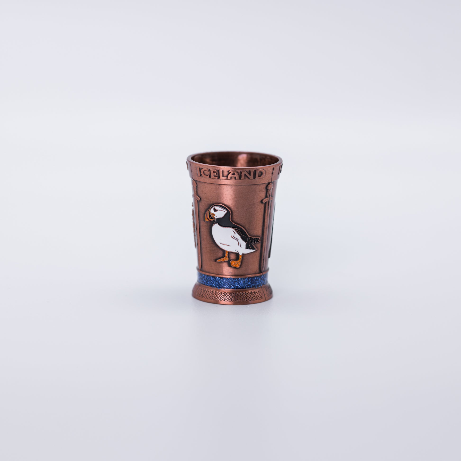 Steel shot glass with a rose gold finish featuring the Icelandic coat of arms, puffin, and Hallgrímskirkja, combining warmth and iconic symbols.
