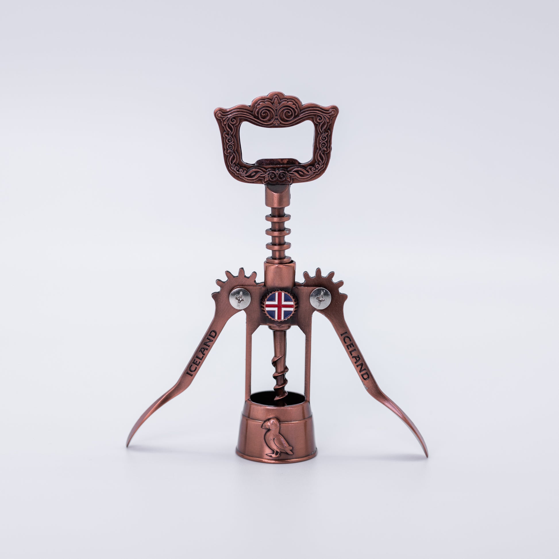 Rose gold wine opener featuring Iceland's coat of arms and a puffin, merging utility with Icelandic symbolism.
